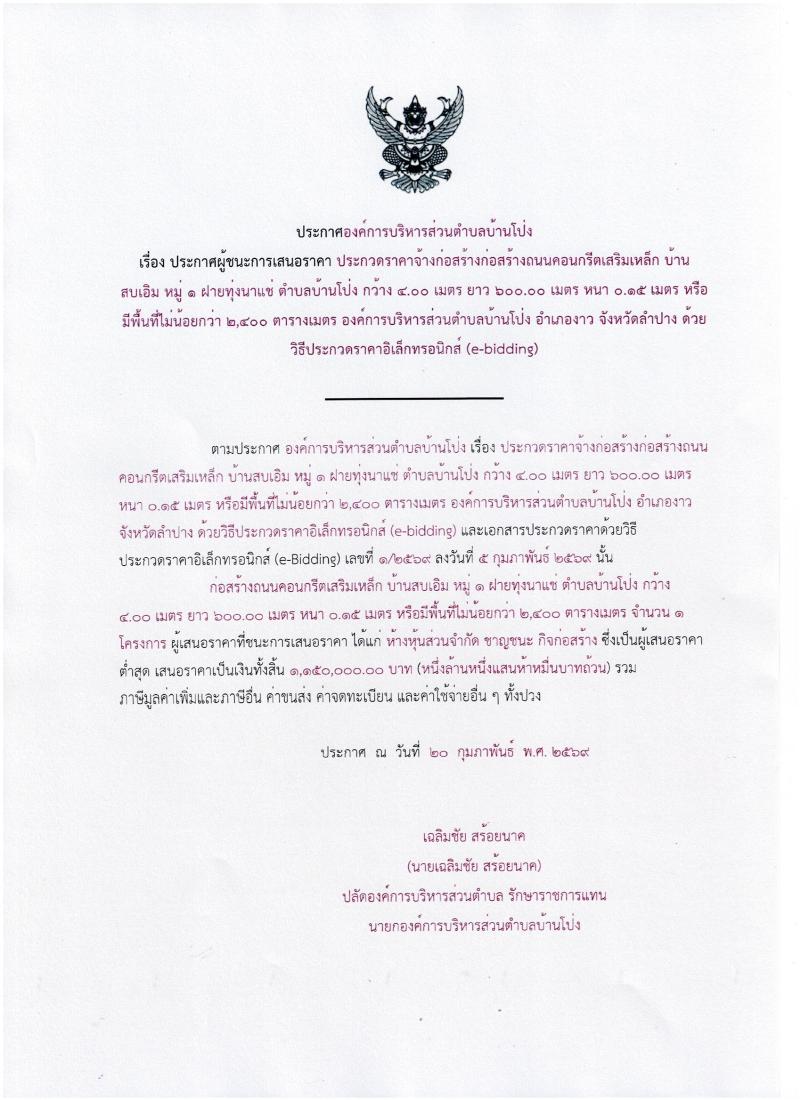 ประกาศ เรื่องประกาศผู้ชนะการเสนอราคา ประกวดราคาจ้างก่อสร้างถนนคอนกรีตเสริมเหล็ก บ้านสบเอิม หมู่ 1 ฝายทุ่งนาแช่ ตำบลบ้านโป่ง อำเภองาว จังหวัดลำปาง