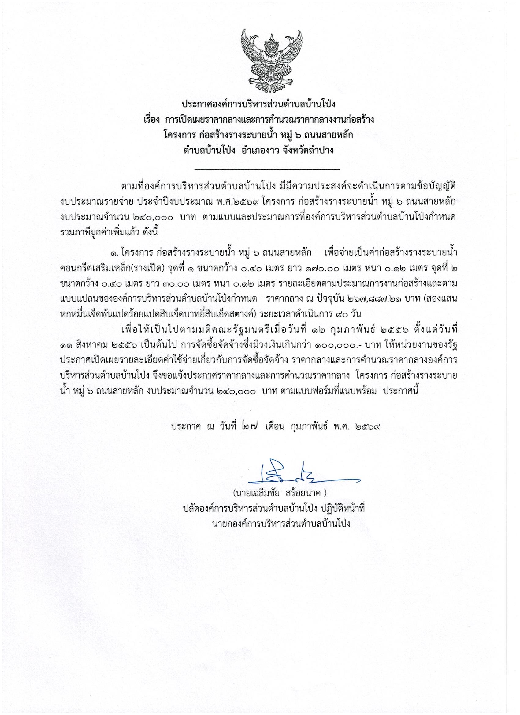 ประกาศองค์การบริหารส่วนตำบลบ้านโป่ง เรื่อง การเปิดเผยราคากลางและการคำนวณราคากลางงานก่อสร้าง โครงการก่อสร้างรางระบายน้ำ หมู่ 6 ถนนสายหลัก