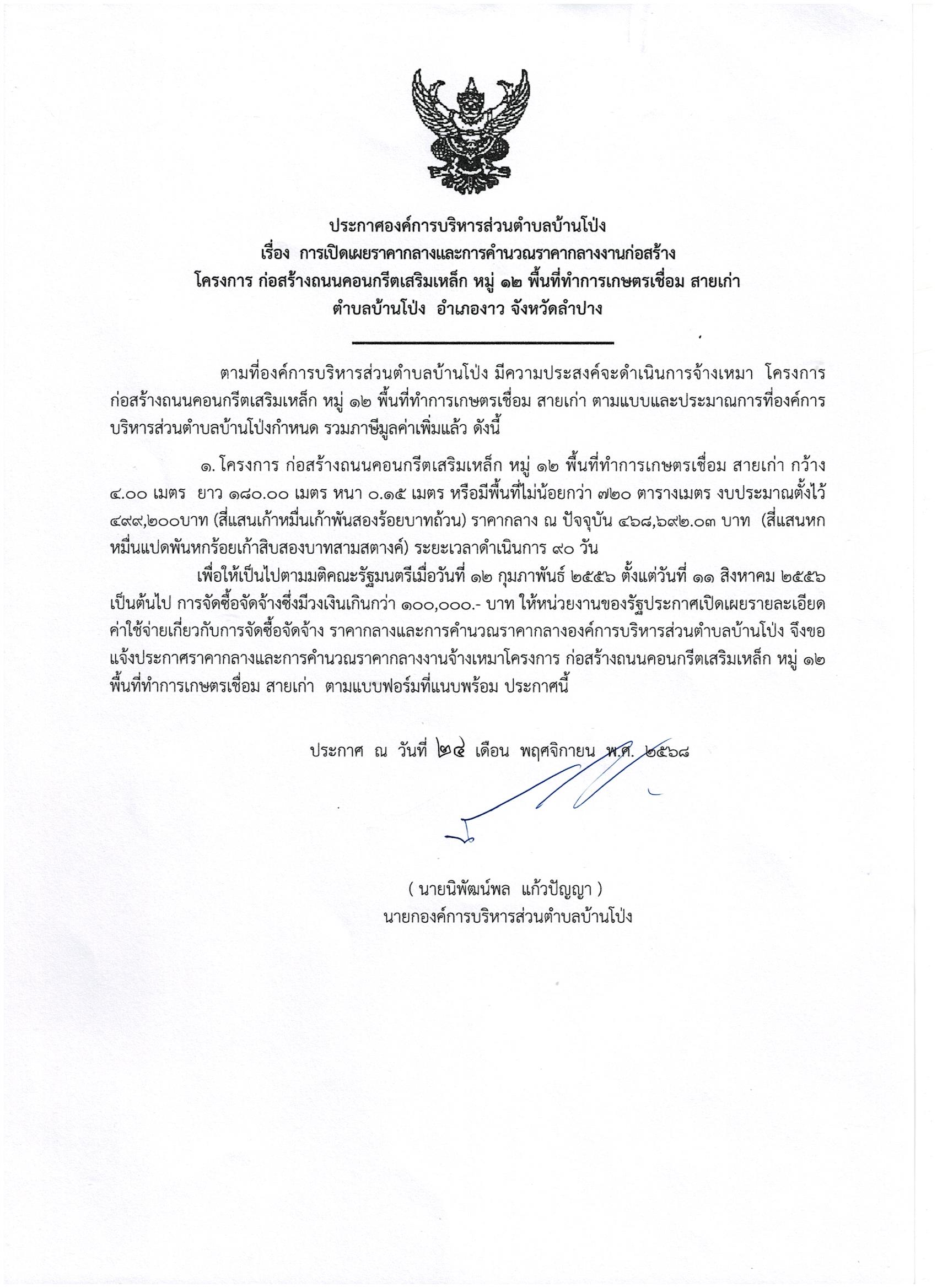 ประกาศองค์การบริหารส่วนตำบลบ้านโป่ง เรื่อง เปิดเผยราคากลาและการคำนวณราคากลางงานก่อสร้าง โครงการก่อสร้างถนนคอนกรีตเสริมเหล็ก หมู่ 12 พื้นที่ทำการเกษตร สายเก่า (งบอุดหนุนเฉพาะกิจ 2569)