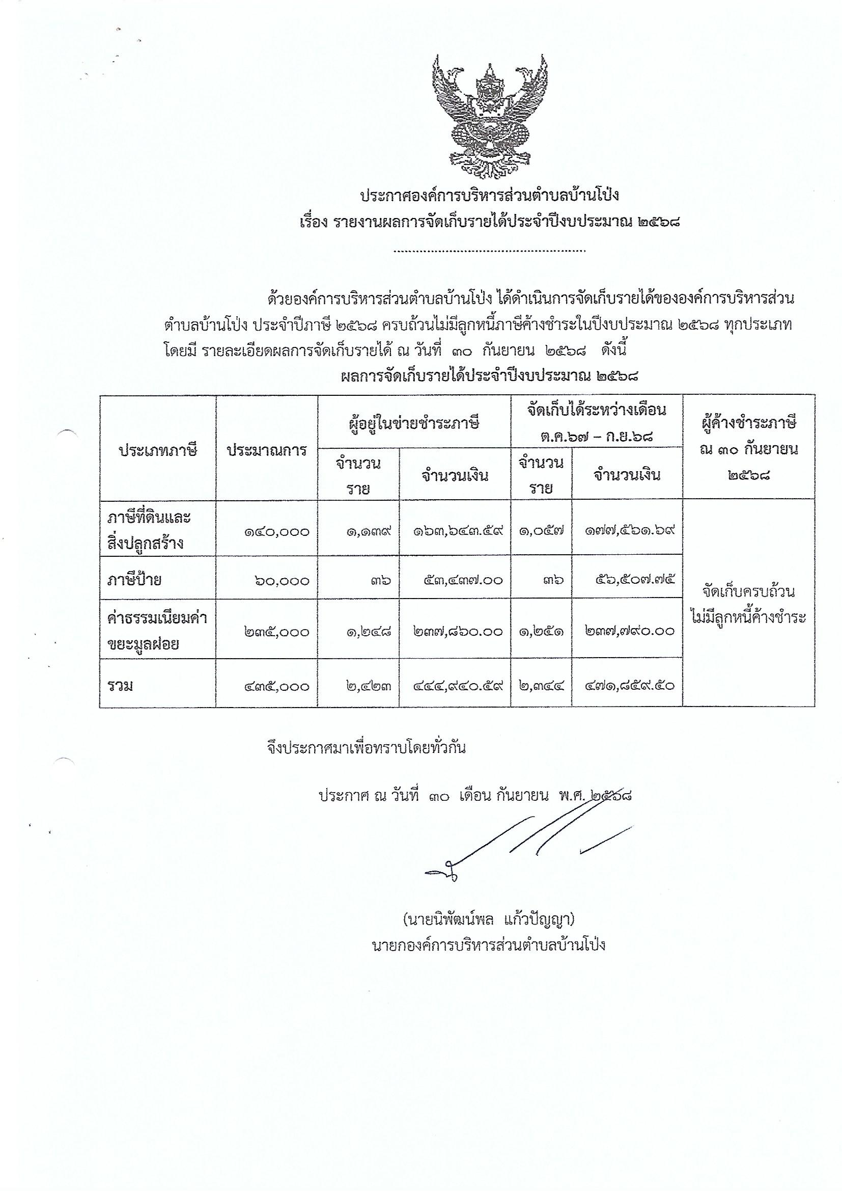 บัดนี้ จัดเก็บรายได้ ได้ดำเนินการจัดเก็บภาษีและค่าธรรมเนียมต่าง ๆ ประจำปีงบประมาณ 2568 เป็นที่เรียบร้อยแล้ว จึงขอรายงานผลการดำเนินงานให้ทราบดังนี้