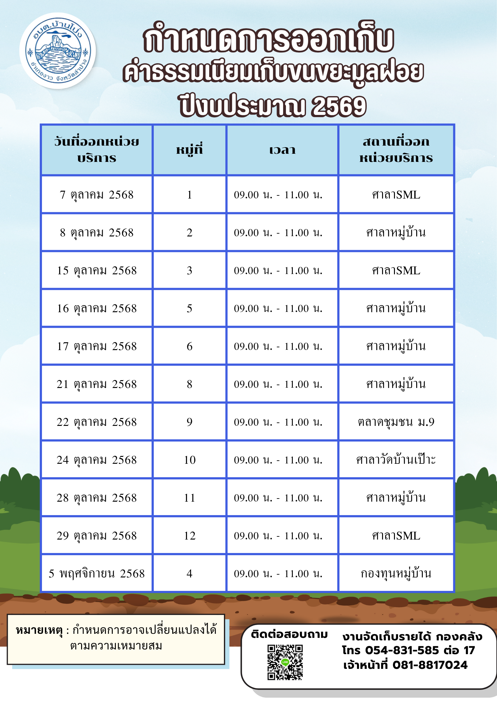กำหนดการออกบริการจัดเก็บค่าธรรมเนียมเก็บขนขยะมูลฝอยนอกสถานที่ ครั้งที่ 1 ประจำปีงบประมาณ 2569