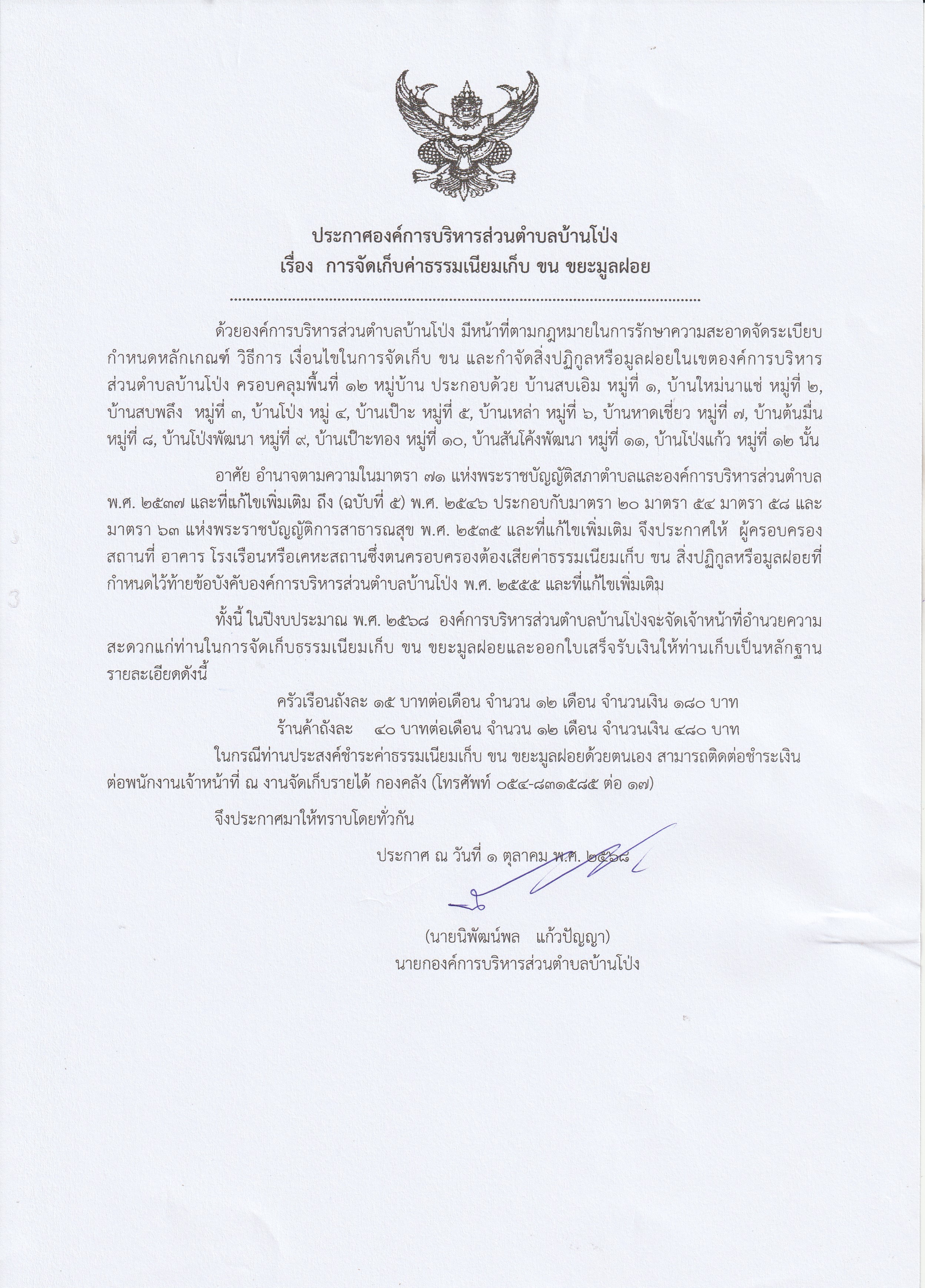 ประกาศองค์การบริหารส่วนตำบลบ้านโป่ง การจัดเก็บค่าธรรมเนียมเก็บ ขน ขยะมูลฝอย
