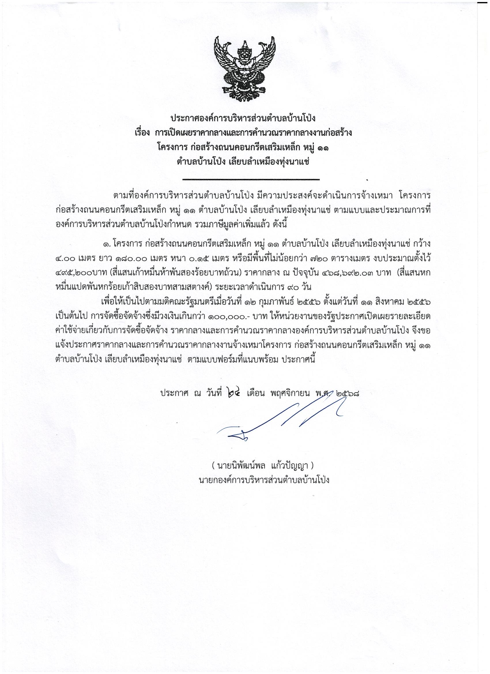 ประกาศองค์การบริหารส่วนตำบลบ้านโป่ง เรื่อง เปิดเผยราคากลาและการคำนวณราคากลางงานก่อสร้าง โครงการก่อสร้างถนนคอนกรีตเสริมเหล็ก หมู่ 11 ตำบลบ้านโป่ง เลียบลำเหมืองทุ่งนาแช่ (งบอุดหนุนเฉพาะกิจ 2569)