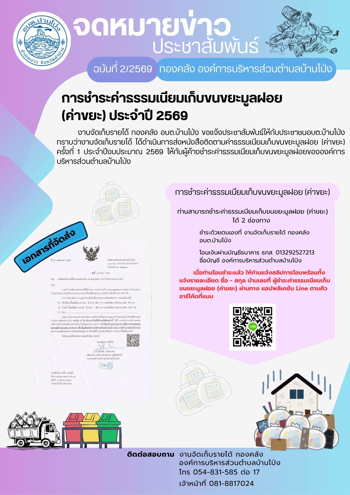 งานจัดเก็บรายได้ กองคลัง อบต.บ้านโป่ง ได้ดำเนินการการจัดส่งหนังสือติดตามค่าธรรมเนียมเก็บขนขยะมูลฝอย (ค่าขยะ) ครั้งที่ 1 ประจำปีงบประมาณ 2569 ให้กับผู้ค้างชำระ และช่องทางในการชำระค่าธรรมเนียมเก็บขนขยะมูลฝอย (ค่าขยะ) ขององค์การบริหารส่วนตำบลบ้านโป่ง